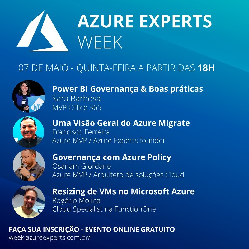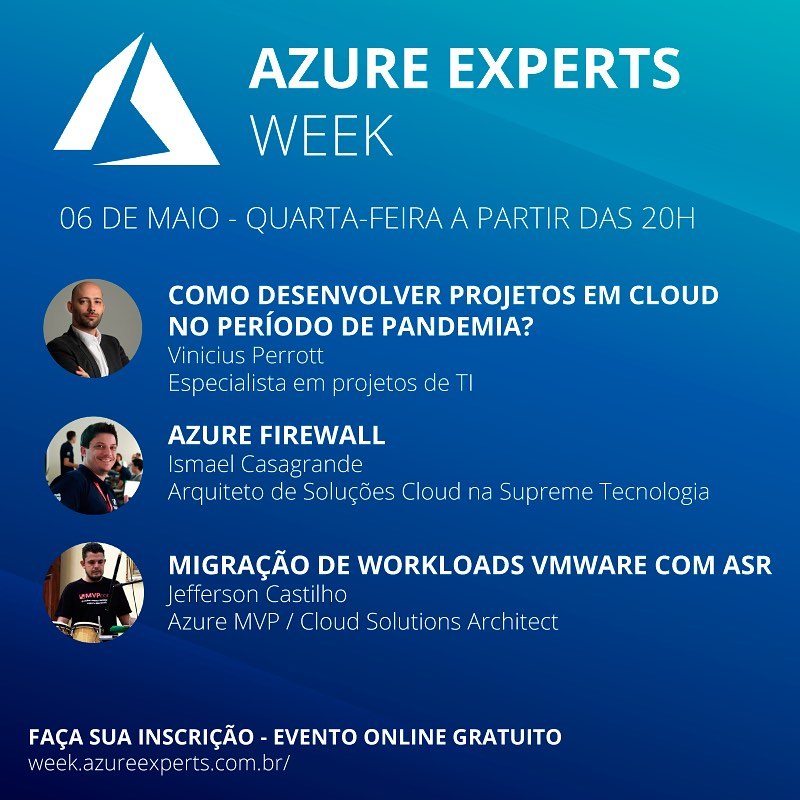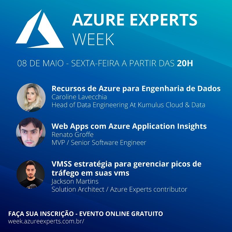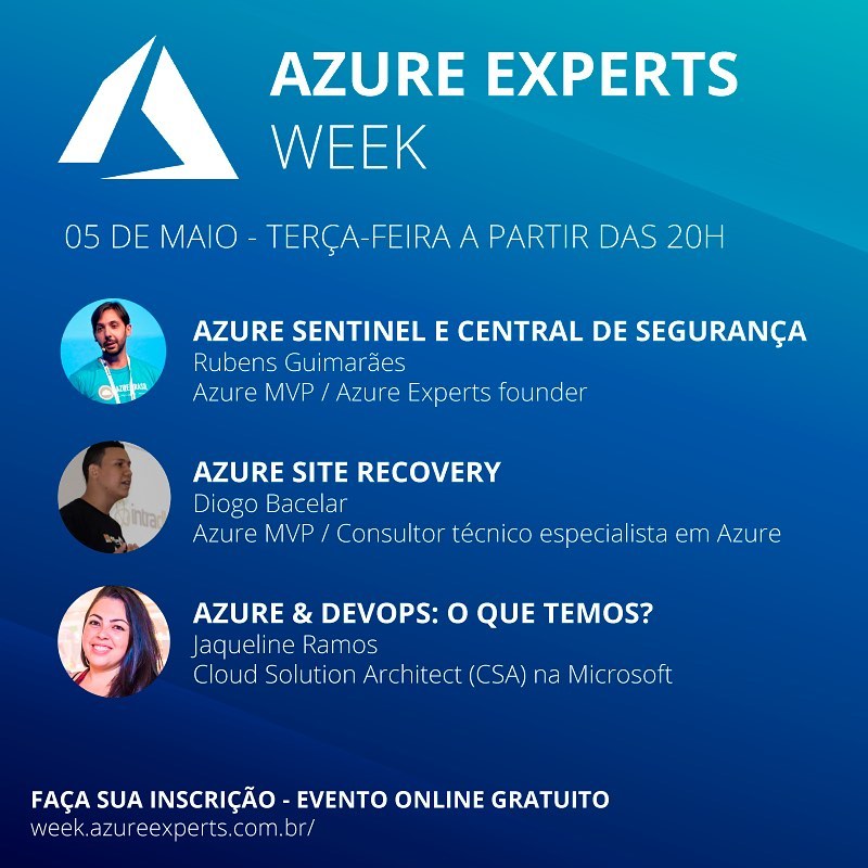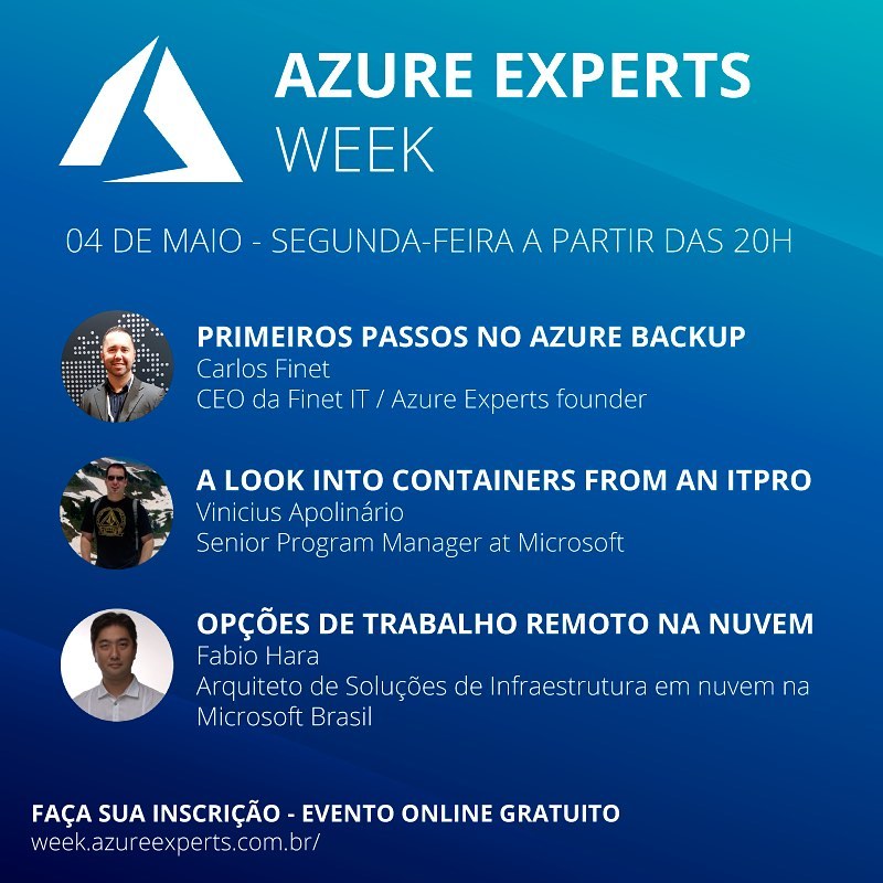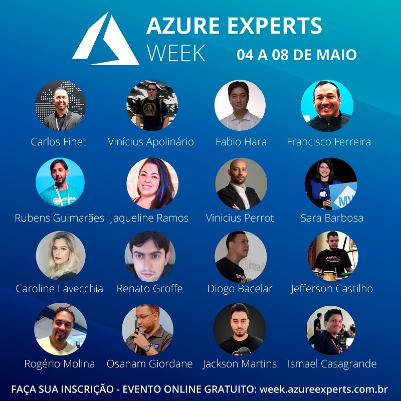 De 04 a 08 de maio aconteceu o Azure Experts Week com transmissão ao vivo de palestras através do Facebook e Youtube. Um evento realizado pela comunidade técnica com o objetivo de compartilhar conhecimento sobre cloud moderno. Um evento organizado por Rubens Guimarães, Carlos Finet, Francisco Ferreira e Jackson Martins.