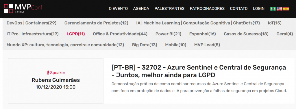 [PT-BR] – 32702 – Azure Sentinel e Central de Segurança – Juntos, melhor ainda para LGPD está agendada para 10/12/2020 15:00.