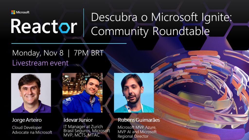 Rubens Guimarães, invited by Microsoft to participate in the Microsoft Ignite – Community Roundtable event, commenting on the news presented at Microsoft Ignite 2021. The event took place on Microsoft channels and was later published on Microsoft Reactor Brasil’s Youtube.