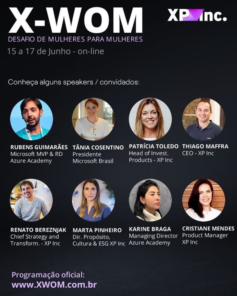 O X-WOM – Desafio para mulheres, evento com organização dirigida por Rubens Guimarães foi realizado em 03 dias promovendo conhecimento, integração e o desenvolvimento de soluções tecnológicas baseadas em nuvem, além de incentivar a interatividade entre as participantes em um ambiente (online) de inovação, inclusão e colaboração multicultural.