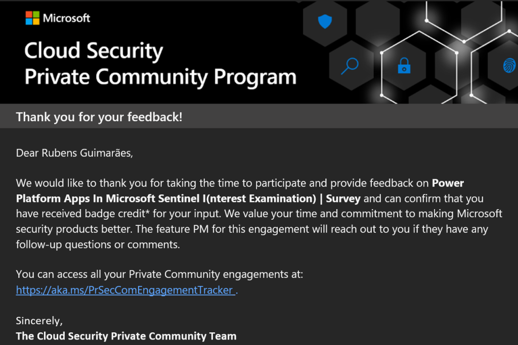Recebendo um agradecimento especial da equipe de produtos da Microsoft por enviar feedbacks sobre temas relacionados à segurança. Microsoft Sentinel.