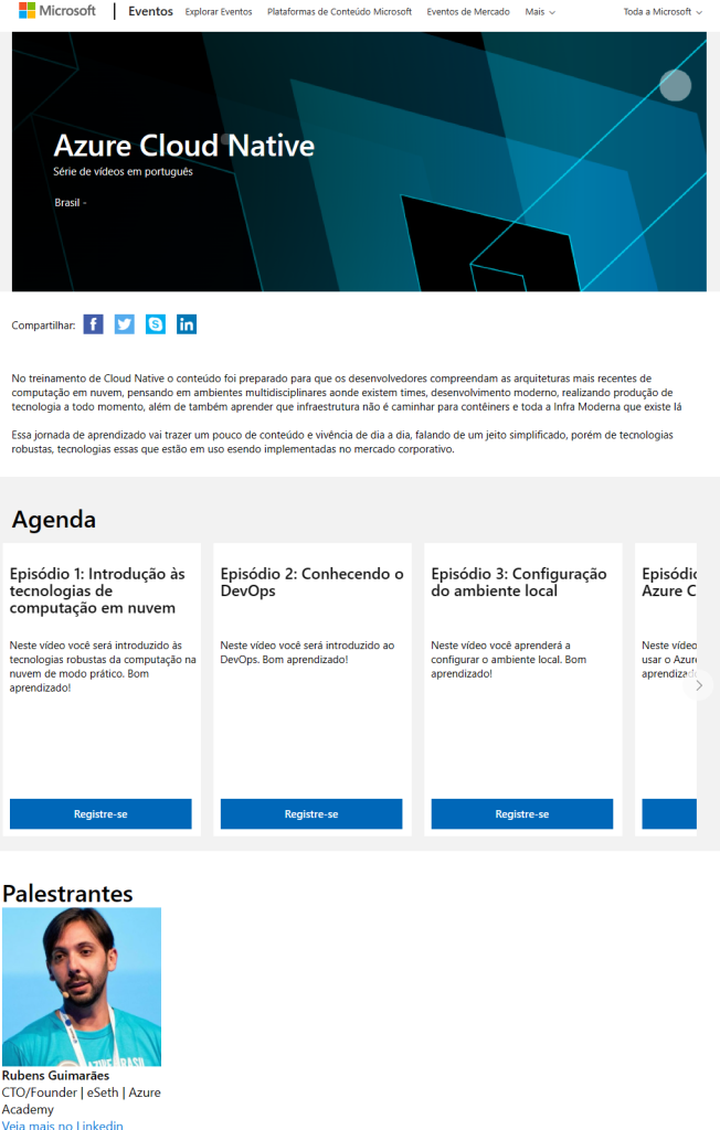 At the invitation of Microsoft Brazil, Rubens Guimarães produced and made available the series of videos Azure Cloud Native, a Hands-on training focused on demonstrating various features of Azure for modernizing applications. The videos are free to access and are available on the Event Hub on the Microsoft website.