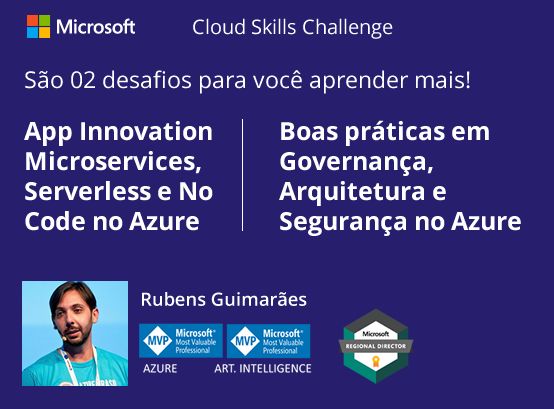 Rubens Guimarães foi convidado pelo time Global de Education da Microsoft para participar de um projeto piloto desenvolvendo um treinamento personalizado na plataforma Microsoft Cloud Skill Challenge. Além do desenvolvimento, Rubens Guimarães convidou a comunidade no Brasil, a experimentar e concluir os challenges que ficaram disponíveis durante o mês de março.