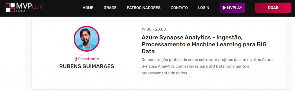 Desde 2017, Rubens Guimarães é convidado para realizar palestra no Visual Studio Summit. Nesta edição, em formato online, o tema escolhido foi como orquestrar projetos de dados em camada BIG Data no Azure Synapse Analytics e soluções para BIG Data em AWS.